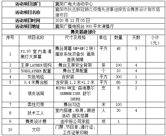 襄阳市抗击新冠肺炎疫情先进事迹报告会,是由中共襄阳市委、襄阳市人民政府主办,中共襄阳市委办公室、中共襄阳市委宣传部、襄阳广播电视台承办的活动。现就其舞美设计制作搭建项目,面向社会公开采购。
