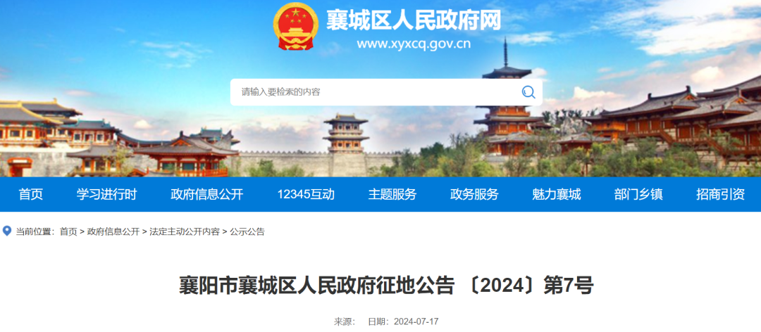 ■ 7月17日,襄城区人民政府官网发布一则征地公告。拟征收余家湖街道办事处王树岗村土地,土地用途为交通场站用地。【阅读详情】