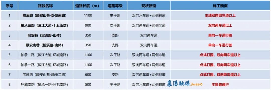 襄阳路桥建设集团有限公司项目总工付君鑫介绍,由于本次改造点位较多,除檀溪路外,后期还需对7条市政道路进行占道挖掘,其中檀溪路、轴承三路、顺安山巷、顺安巷占用面积较大,其他四条道路均采取点式打围方式,占道面积较小,3天即可恢复交通。