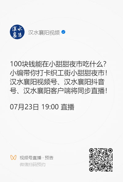 ■ 100块钱能在小甜甜夜市吃什么呢?今晚,小编带你一起打卡织工街小甜甜夜市,来看看100元在夜市上都能吃到哪些东西。7月23日19:00,汉水襄阳视频号、汉水襄阳抖音号、汉水襄阳客户端将同步直播!