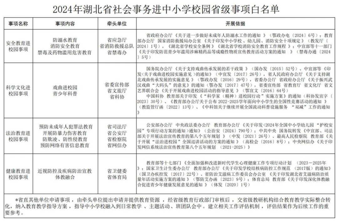 现将《2024年湖北省社会事务进中小学校园省级事项白名单》予以公布,并提出如下要求: