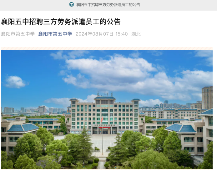 据襄阳市第五中学公众号消息,该学校面向社会公开招聘10名三方劳务派遣员工。具体方案如下: