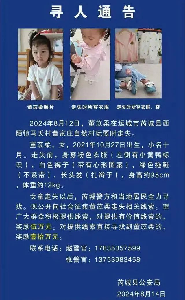 据报道,8月12日上午,山西运城芮城县西陌镇马夭村一2岁女童董苡柔(小名十月)在家中失踪,引发社会关注。其家属称,董苡柔原本在家中和奶奶在一起,奶奶去后屋菜地摘花椒,转身之后发现孩子不见踪影。