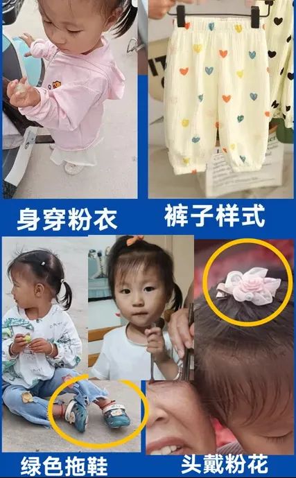董苡柔,女,2021年10月27日出生,小名十月。走失前,身穿粉色衣服 (左侧有小黄鸭标识 ),白色裤子(带有心形图案),绿色拖鞋( 不系带),长头发( 扎辫子 ),身高约95cm,体重约12kg。