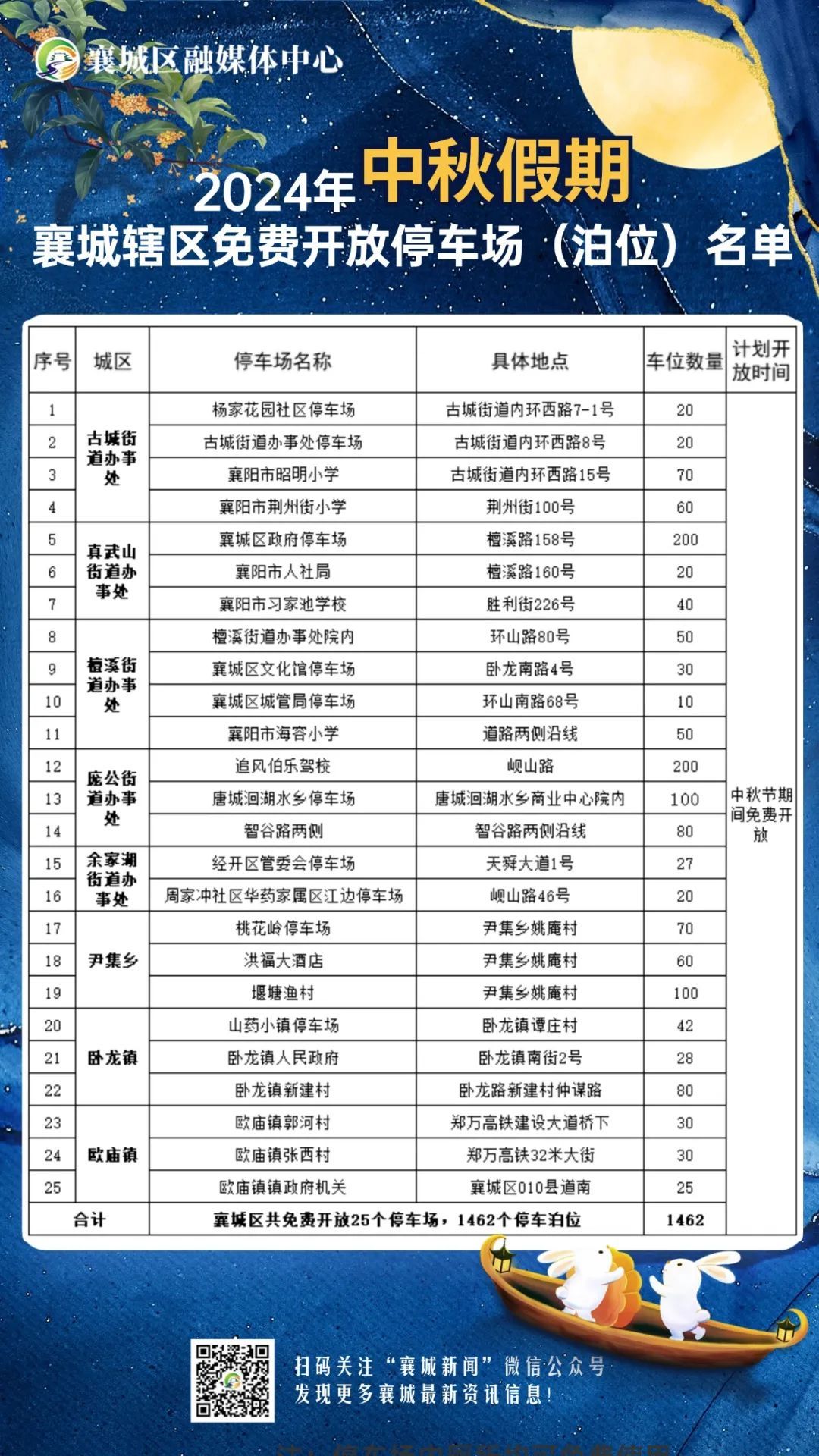 自2024年9月15日—9月17日,襄城区党政机关、事业单位、社区、学校等单位停车场(泊位)共计25个点位,1462个停车位,将免费对外开放。欢迎各地游客朋友乐游襄城。