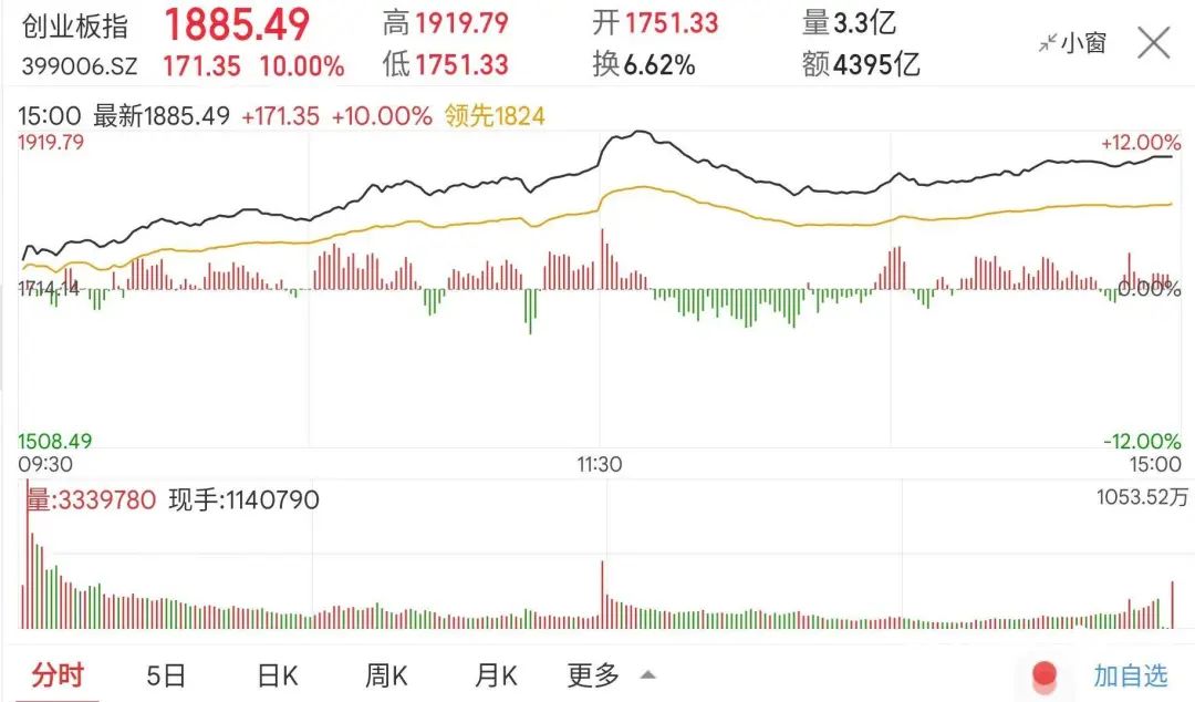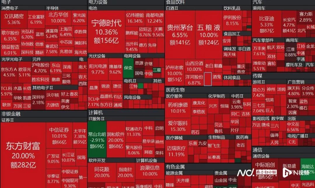 随着创业板指数大幅走高,创业板指数成交额突破历史天量,达4395亿元。创业板权重股集体大涨,东方财富涨停,宁德时代涨超10%。