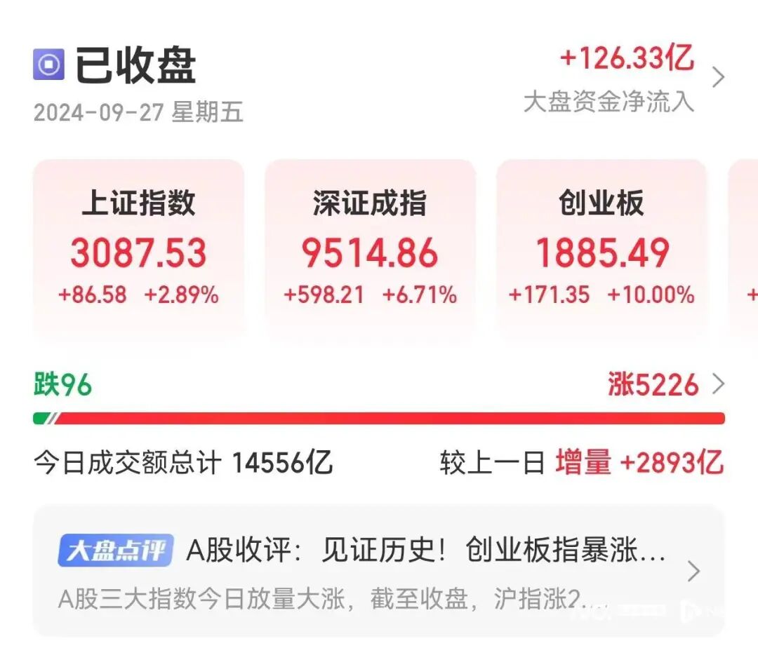 今日(9月27日),A股继续放量大涨,上交所交易系统一度出现延迟。截至当日收盘,上证指数报3087.53点,涨2.89%;深证成指报9514.86点,涨6.71%;创业板指报1885.49点,涨10.00%,北证50指数报717.02,涨11.14%。全市超5200只个股上涨,137股涨停,成交额达14562亿元,较上日放量2893亿元。