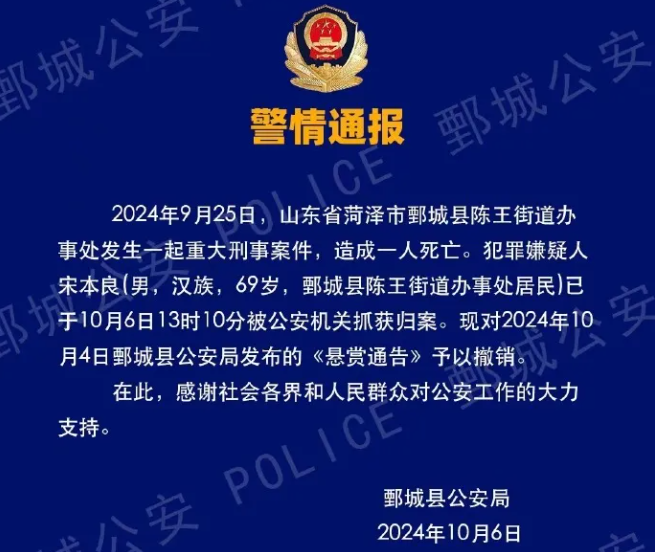 ■ 10月6日,山东菏泽鄄城警方通报:重大刑事案件69岁犯罪嫌疑人宋本良已被抓获归案。