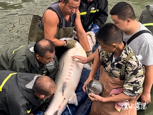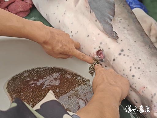 近日,在谷城县庙滩镇中华鲟繁育基地,4条中华鲟顺利产下近百万枚鱼卵。