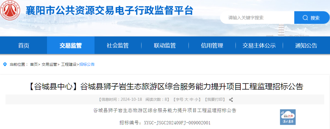 10月18日,襄阳市公共资源交易网发布《谷城县狮子岩生态旅游区综合服务能力提升项目工程监理招标公告》。