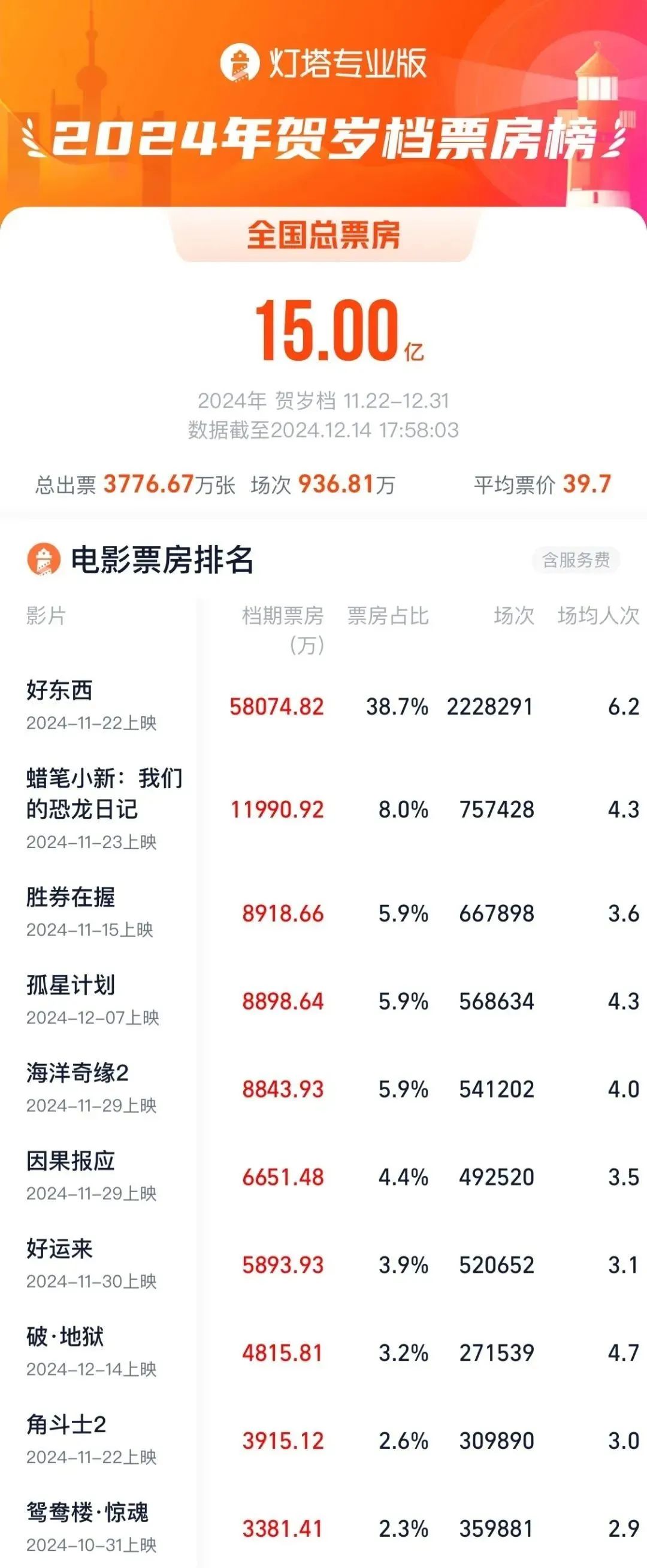 ■ 据网络平台数据,截至12月14日17时58分,2024年贺岁档(11月22日-12月31日)档期票房(含预售)突破15亿。
