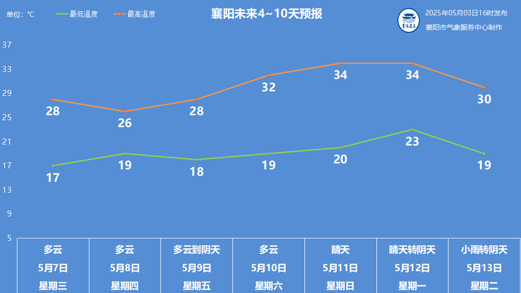 5月4日晚到5日:小雨转晴天, 偏北风2~3级转3~4级,15~29℃