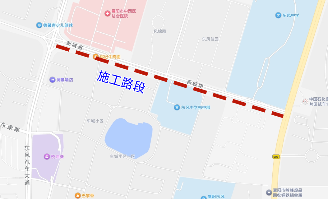 二、2025年7月20日至11月30日占用新城路(东风汽车大道至奔驰大道段)两侧辅道分段封闭打围施工,施工期间施工路段辅道禁止通行。