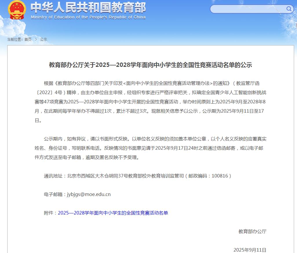 教育部官网公示内容显示,47项竞赛举办时间原则上为2025年9月至2028年8月,在此期间每学年举办不得超过1次,累计不超过3次。公示期为2025年9月11日至17日。