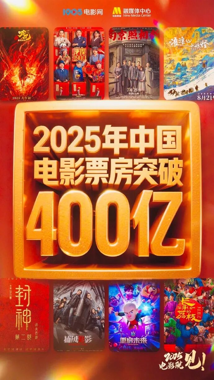 9月13日,中国电影报道发文:据1905电影网统计,截至9月13日,2025年度国内电影市场票房(含预售)突破400亿元!较去年提前75天。截至目前,年度票房榜前十均为国产影片,分别为: