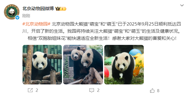 ■ 今年10月1日起,按照国务院发布的《互联网平台企业涉税信息报送规定》有关要求,互联网平台企业将首次正式报送平台内经营者和从业人员的身份信息、收入信息。■ 9月25日下午,北京动物园官方微博发布消息:北京动物园大熊猫“萌宝”和“萌玉”已于2025年9月25日顺利抵达四川,开启了新的生活。