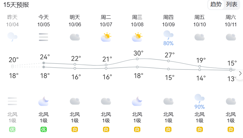 后晚到大后天:多云到晴天,偏北风2~3级,19~31℃(襄阳市气象台10月5日16时发布)
