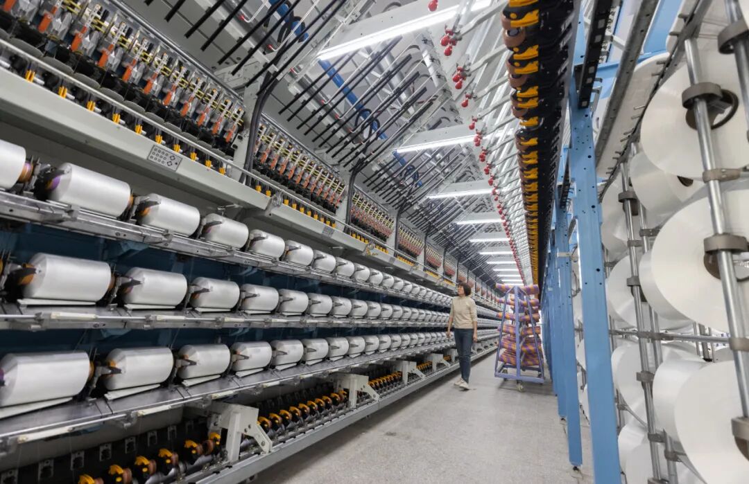 湖北省三圆纺织科技有限公司生产车间,加弹机“吐出”一卷卷锦纶长丝。