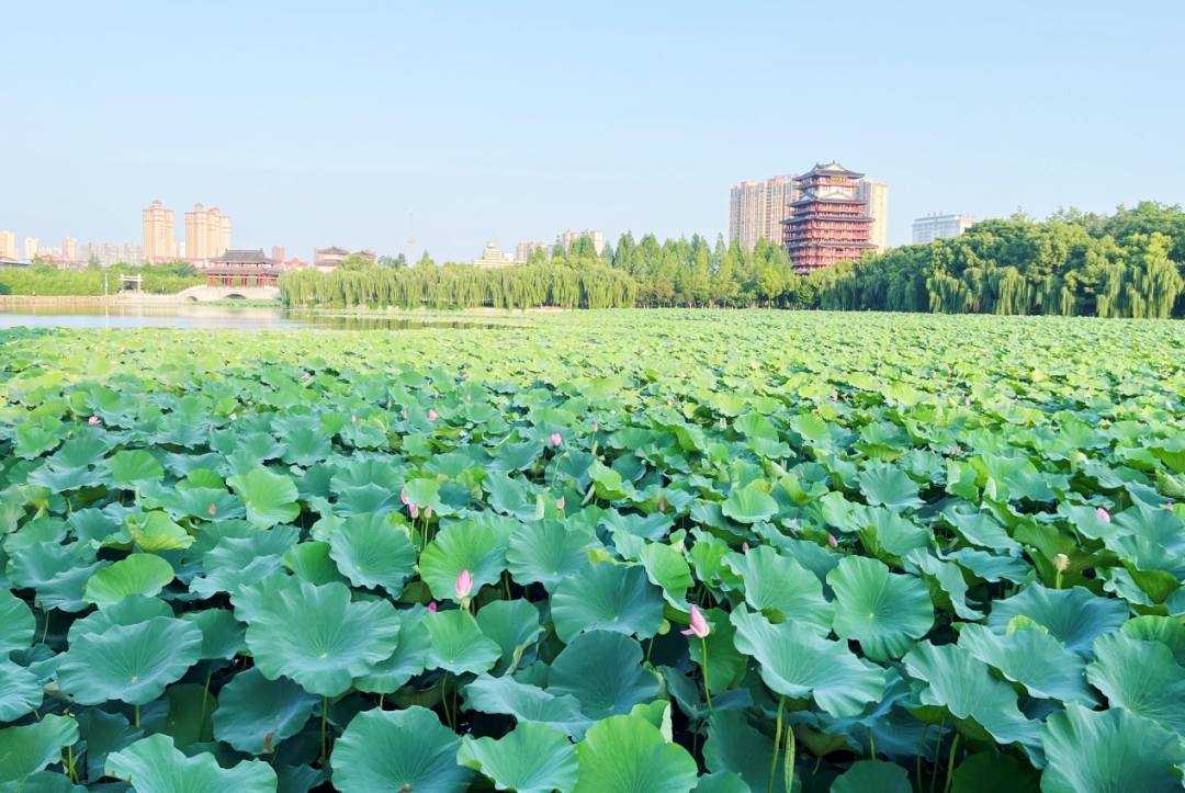 视线投到北边,偌大的北湖公园里,湖光水色两相和,绿树繁花绕曲径,健身游玩的人群络绎不绝。