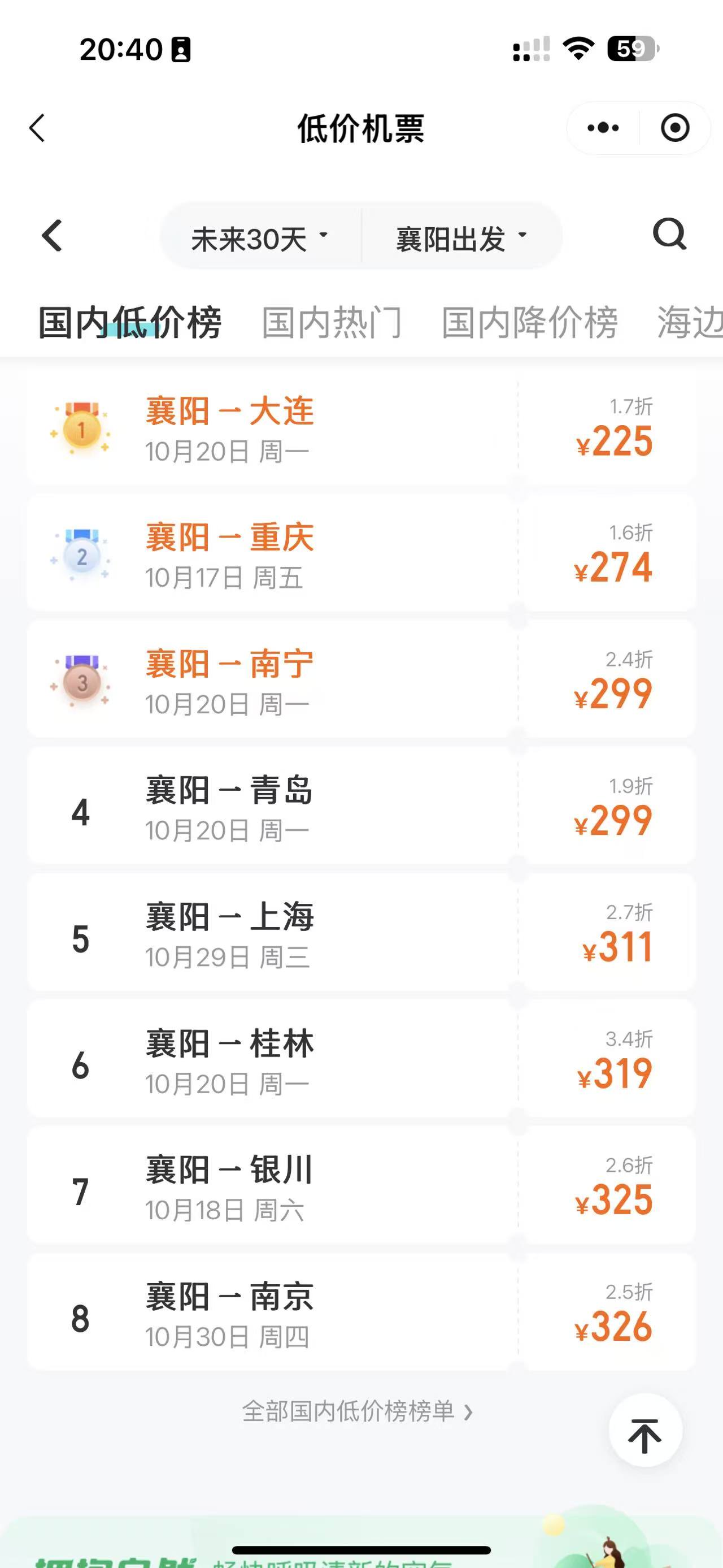 襄阳至大连、重庆、南宁、青岛、上海等多地机票也有较大折扣