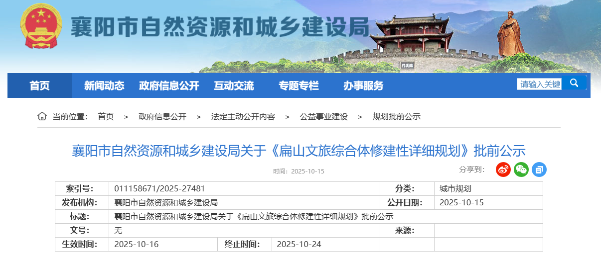近日,襄阳市自然资源和城乡建设局发布关于《扁山文旅综合体修建性详细规划》批前公示。