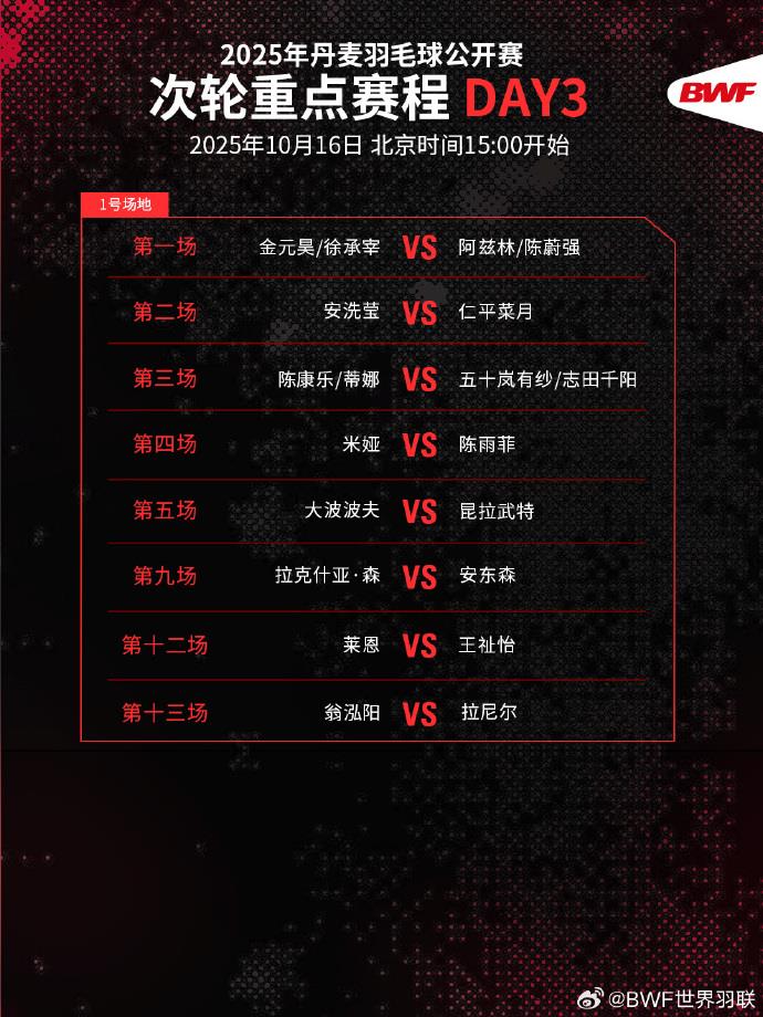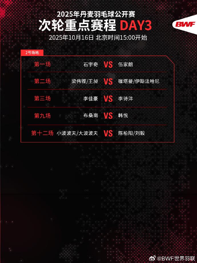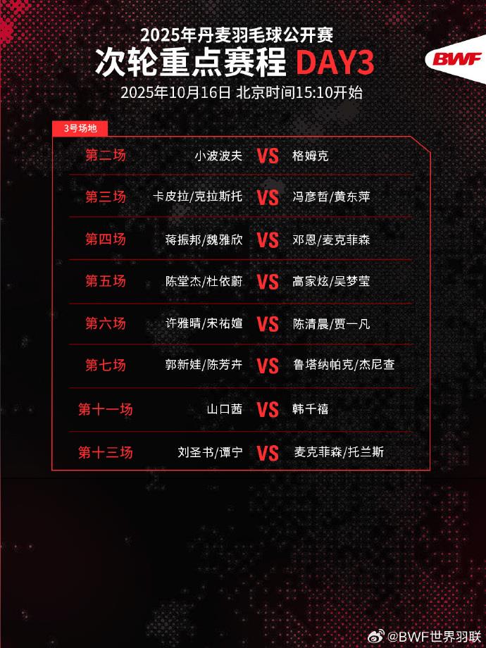 “梁王”组合出击 丹麦羽毛球公开赛次轮第三日赛程出炉 2025-10-16 12:20 央视新闻客户端 0 2025年丹麦羽毛球公开赛次轮第三日赛程出炉,将于今天(10月16日)15时开打。 焦点战关注:翁泓阳vs拉尼尔、高家炫/吴梦莹vs陈堂杰/杜依蔚、梁伟铿/王昶vs咖塔曼/伊斯法哈尼等。 具体赛程如下: 来源:央视新闻客户端 编辑:李春辉